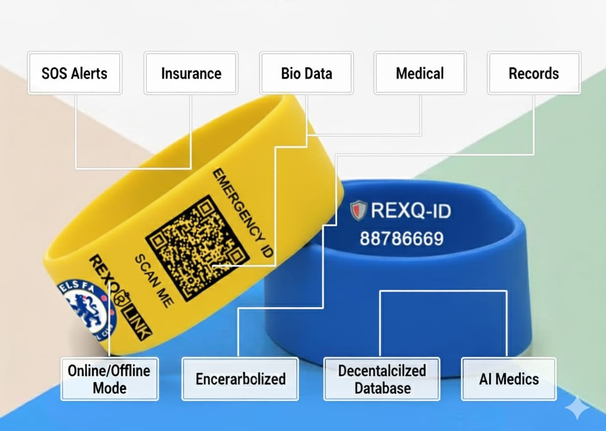 REXQ ID Wearable sends instant emergency alerts, provides medics vital medical info, and offers convenient PAYGO insurance.